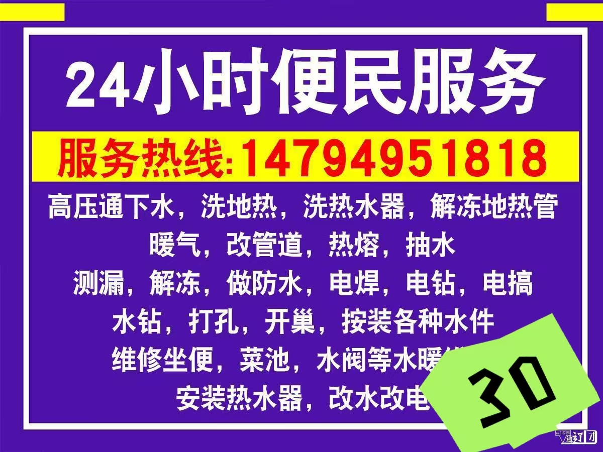 高压通下水,洗地热,洗热水器,解冻地热管,暖气,改管道,热熔,抽水。测漏,解冻,做防水,电焊,电钻,电搞,水钻,打孔,开巢,按装各种水件,维修坐便,菜池,水阀等水暖维修,安装热水器,改水改电,24小时为你服务,联系电话14794951818