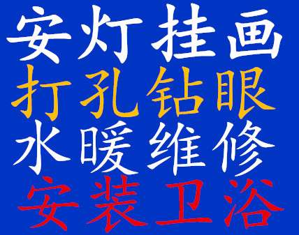 安灯插座安装,组装衣柜鞋柜书柜,打孔钻眼安装热水器,吸油烟机,壁挂电视。挂婚纱照十字绣艺术品。按窗帘滑道罗马杆,改水改电,水暖维修热熔焊接,清洗地热等